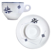 The NORTHWIND coffee set, made of melamine, is composed of 6 cups and 6 saucers in white with navy blue compass rose decorations.The saucers prevent spillage as they have a cavity in which the cup sits to make it more stable.