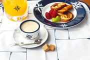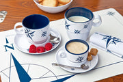The NORTHWIND coffee set, made of melamine, is composed of 6 cups and 6 saucers in white with navy blue compass rose decorations.