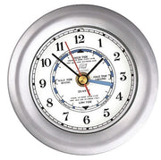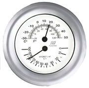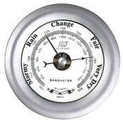Gleam or matt chrome case. Bevelled glass edge. Front facia Ø : 8.8 cm.  Base Ø : 13 cm. Barometer : High sensitivity aneroid barometer, with an entirely metallic chain. Clock : Quartz mechanism.