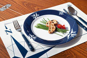 The unbreakable melamine dishes in this tableware set have a decorated border, like the other accessories in the collection, in navy blue and white tones with a compass rose.