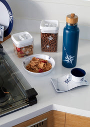 Practical set of 4 clear kitchen jars with nautical design. Made of MS – a virtually unbreakable material – perfect for a boat.