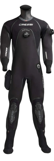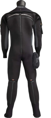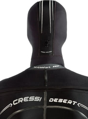 The Cressi Desert is a premium drysuit made from pre-compressed 4 mm high-density neoprene for excellent thermal insulation and minimal buoyancy shifts. Reinforced with Liquid Seal seams and X-DIAMOND abrasion panels, it offers rugged protection in cold waters. Features include smooth neoprene seals, Sitech® inflation/dump valves, soft socks, a large thigh pocket, and an included 5 mm hood—engineered for serious divers seeking dryness and durability.