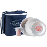 Melamine tableware pack HARMONY CORAL of 16 pc, practical set of nautical tableware for 4 people. It consists of 4 dinner plates, 4 soup plates, 4 dessert plates, 4 stackable and non-slip mugs and a carry bag. All pieces can also be purchased separately.