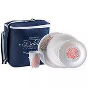 It is made up of 6 dinner plates, 6 soup bowls, 6 dessert plates, 6 stackable non-slip mugs and a carry bag.