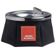 Windproof and shockproof ashtray, made of stainless steel and leatherette fabric.